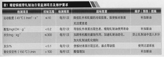 為了確保精密銅板帶軋制油的使用性能,良好的日常監(jiān)控和維護十分重要。這不僅有利于延長精密銅板帶軋制油的使用壽命,降低成本,而且有利于板材的表面質(zhì)量和精度。精密銅板帶軋制油的常規(guī)性能指標包括運動黏度、閃點、傾點、水分、灰分、酸值、銅片腐蝕、餾程、最大無卡咬負荷、氧化安定性等,其日常監(jiān)測項目及維護要求見表1,換油指標要求見表2 。