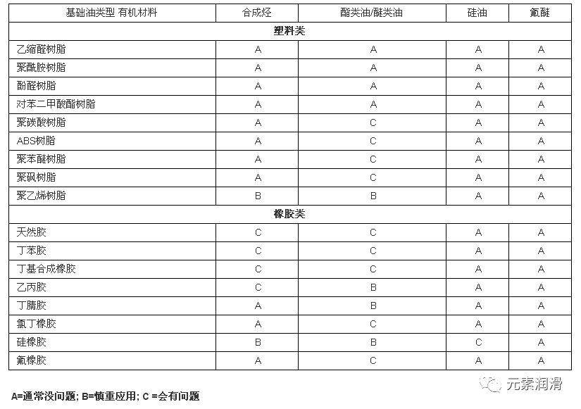 5、材料適應(yīng)性——由于其特殊的化學(xué)結(jié)構(gòu),不同類型的合成油其材料適應(yīng)性有很大的差別,在應(yīng)用合成油為基礎(chǔ)油的潤滑油脂時必須注意其與所接觸的有機材料的相容性問題。下表可以作為油品選用的一般參照,真正應(yīng)用時必須客戶必須與生產(chǎn)商進行討論、甚至試驗來確定。