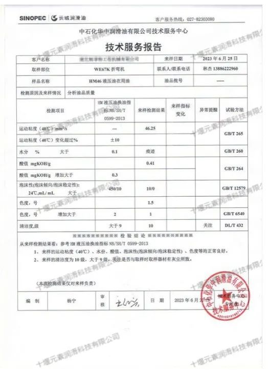 果不其然,6月27日《技術(shù)服務(wù)報(bào)告》出來后,對比NB/SH/T 0599-2013 L-HM《液壓油換油標(biāo)準(zhǔn)》,顯示該在用油的運(yùn)動(dòng)粘度、水分、酸值、泡沫傾向性正常良好,唯一清潔度超標(biāo)了1級(為NAS10級),分析判斷可能是抽取油樣過程中的污染所致,并不影響油品質(zhì)量,能滿足此設(shè)備繼續(xù)使用要求。