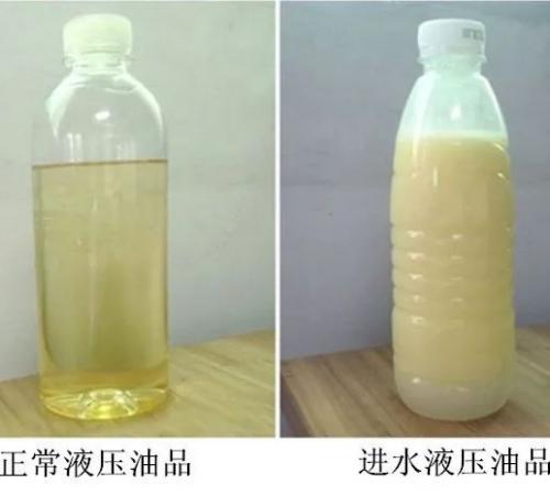 液壓油和水不相溶,且油的密度比水小,當(dāng)油水混合時(shí)在溫度、振動(dòng)、壓力等的作用下,互相包裹形成無(wú)數(shù)的微小分隔面,在光的折射作用下顯現(xiàn)白色,肉眼觀察呈奶白色。