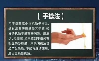將潤(rùn)滑油捻在大拇指與食指之間反復(fù)研磨,較好的潤(rùn)滑油有潤(rùn)滑性、磨屑少、無(wú)摩擦;若感到手指之間有砂粒之類(lèi)較大摩擦感,則表明潤(rùn)滑油內(nèi)雜質(zhì)多,不能再用,應(yīng)更換新潤(rùn)滑油。